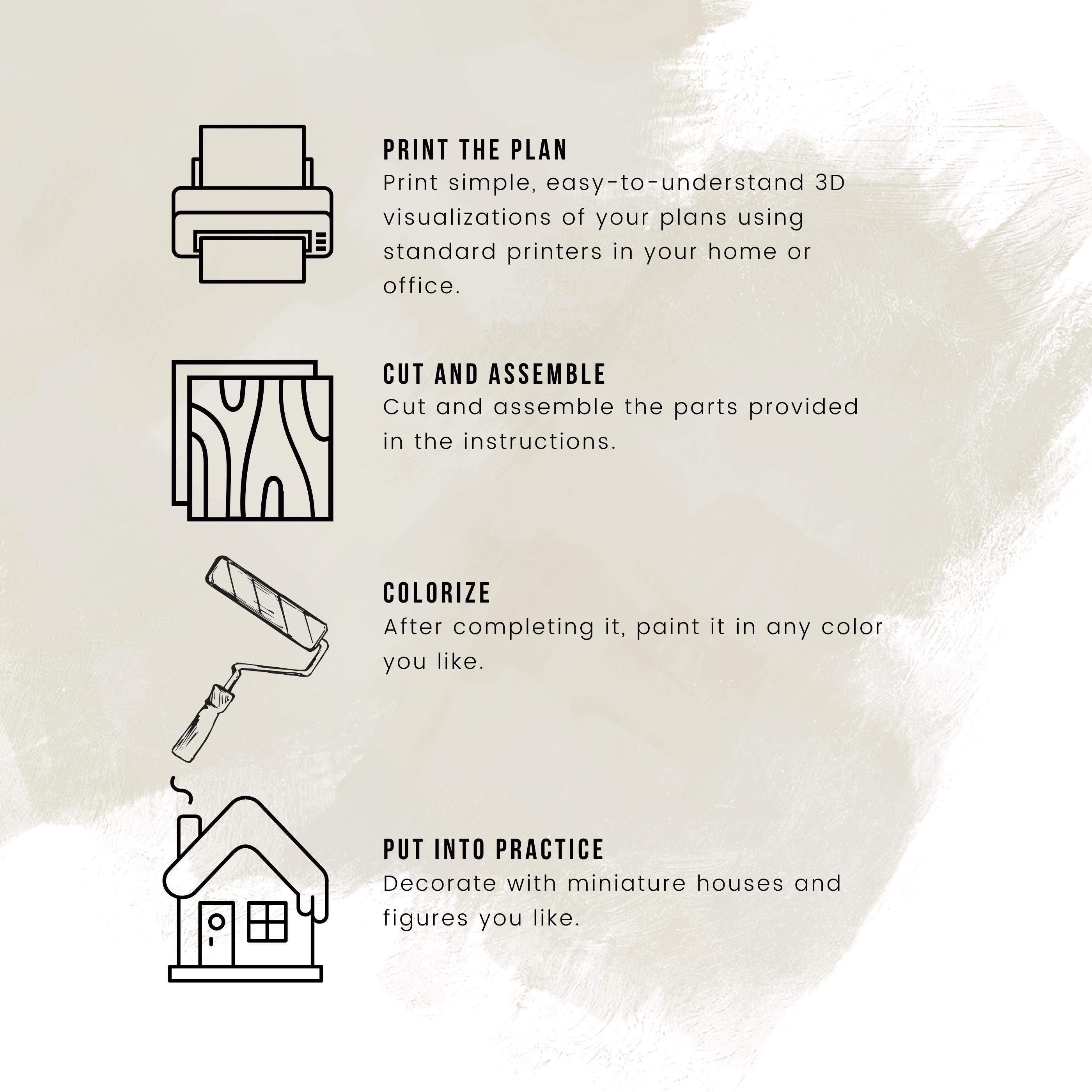 ⦁ 10-page 3D PDF plan with step-by-step measurements and drawings