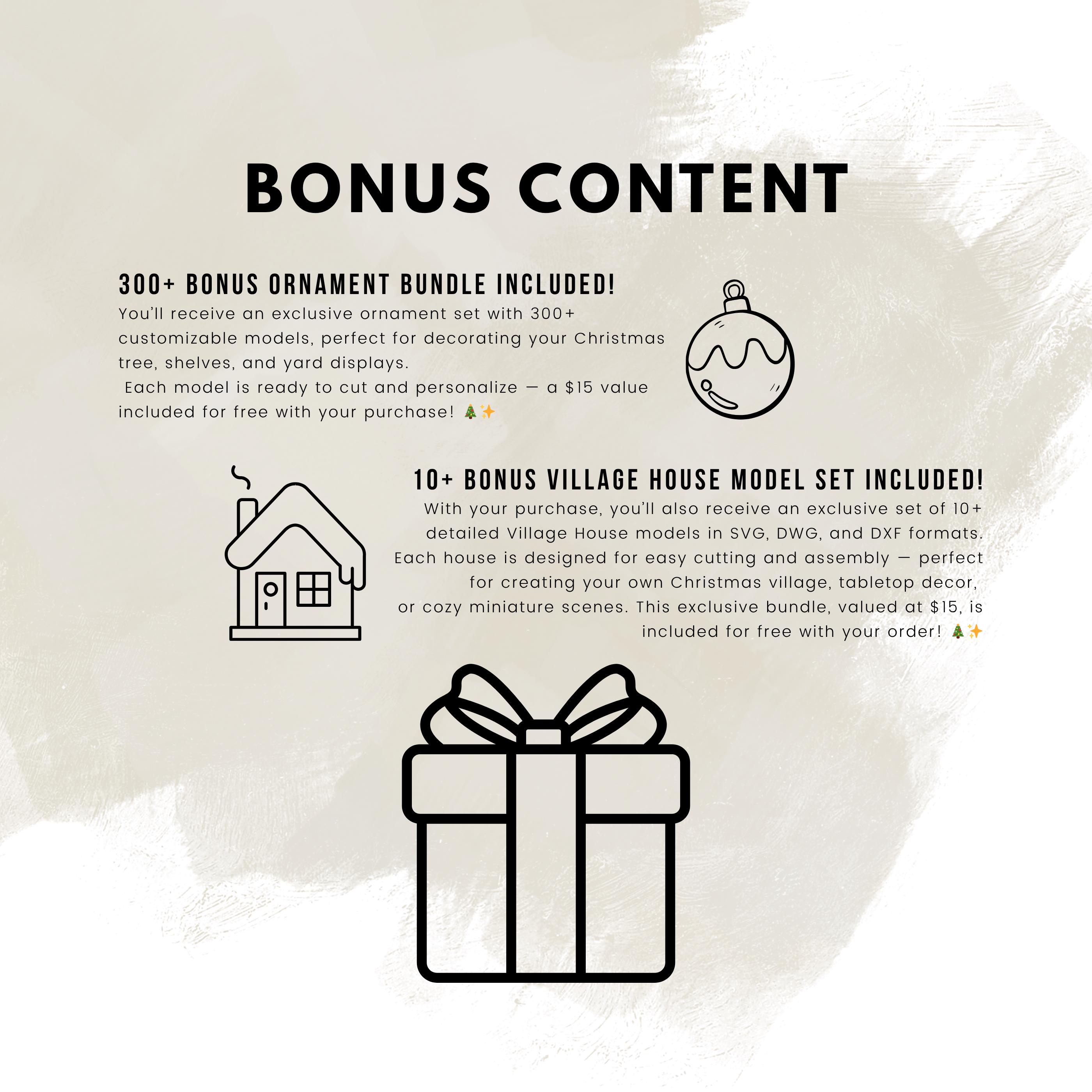 🎁 Bonus Bundle: 10+ Village House models (SVG, DWG, DXF) + 300+ customizable ornaments (a $15 value included for free)