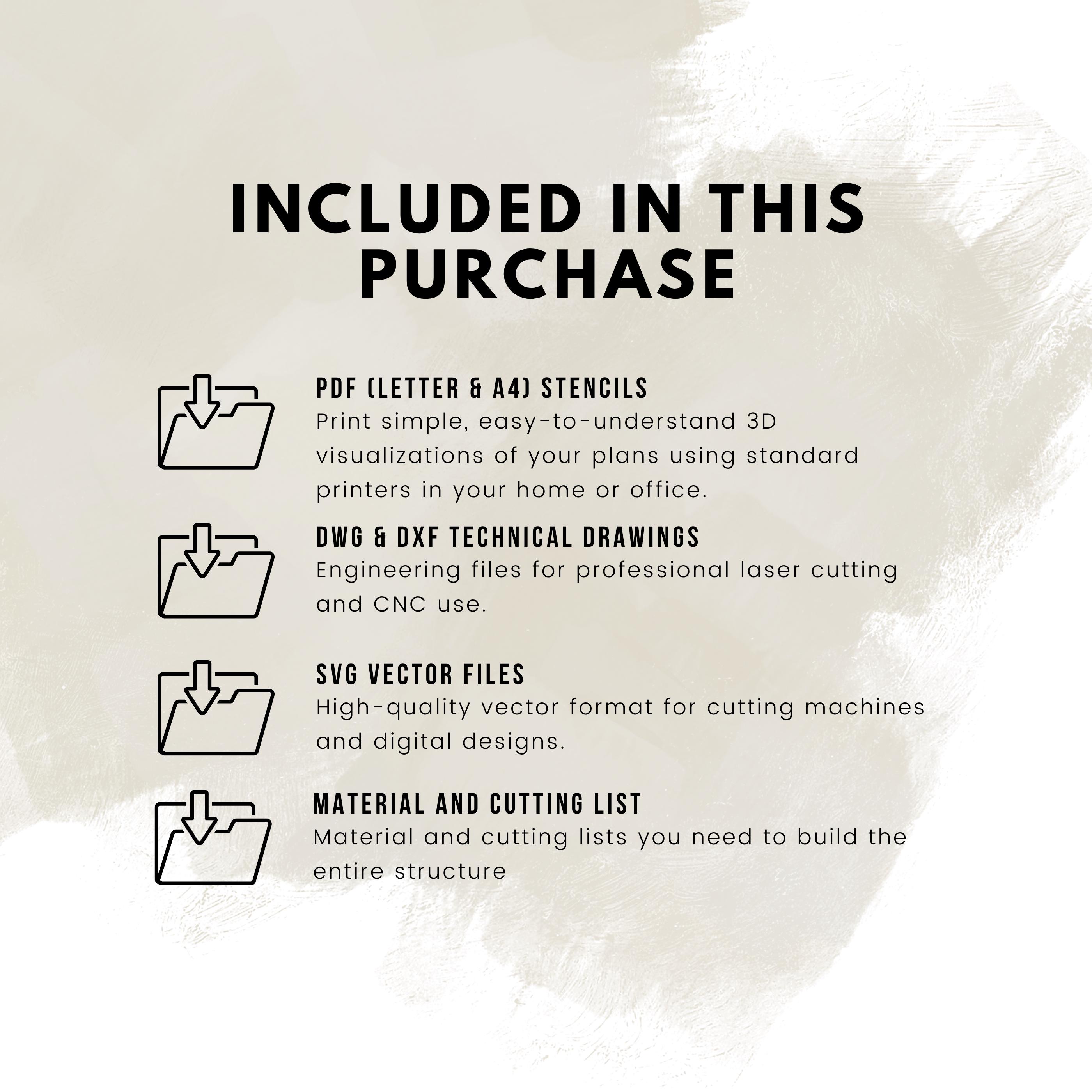 ⦁ DWG & DXF files (cm / mm / inch) for CNC cutting