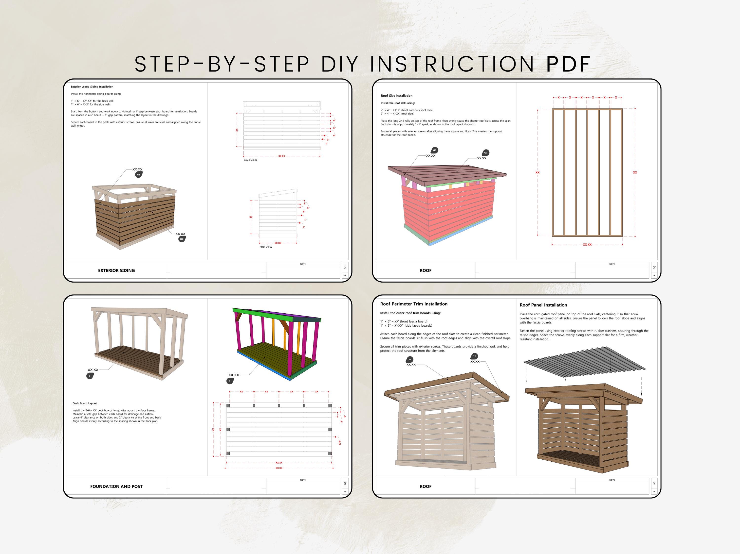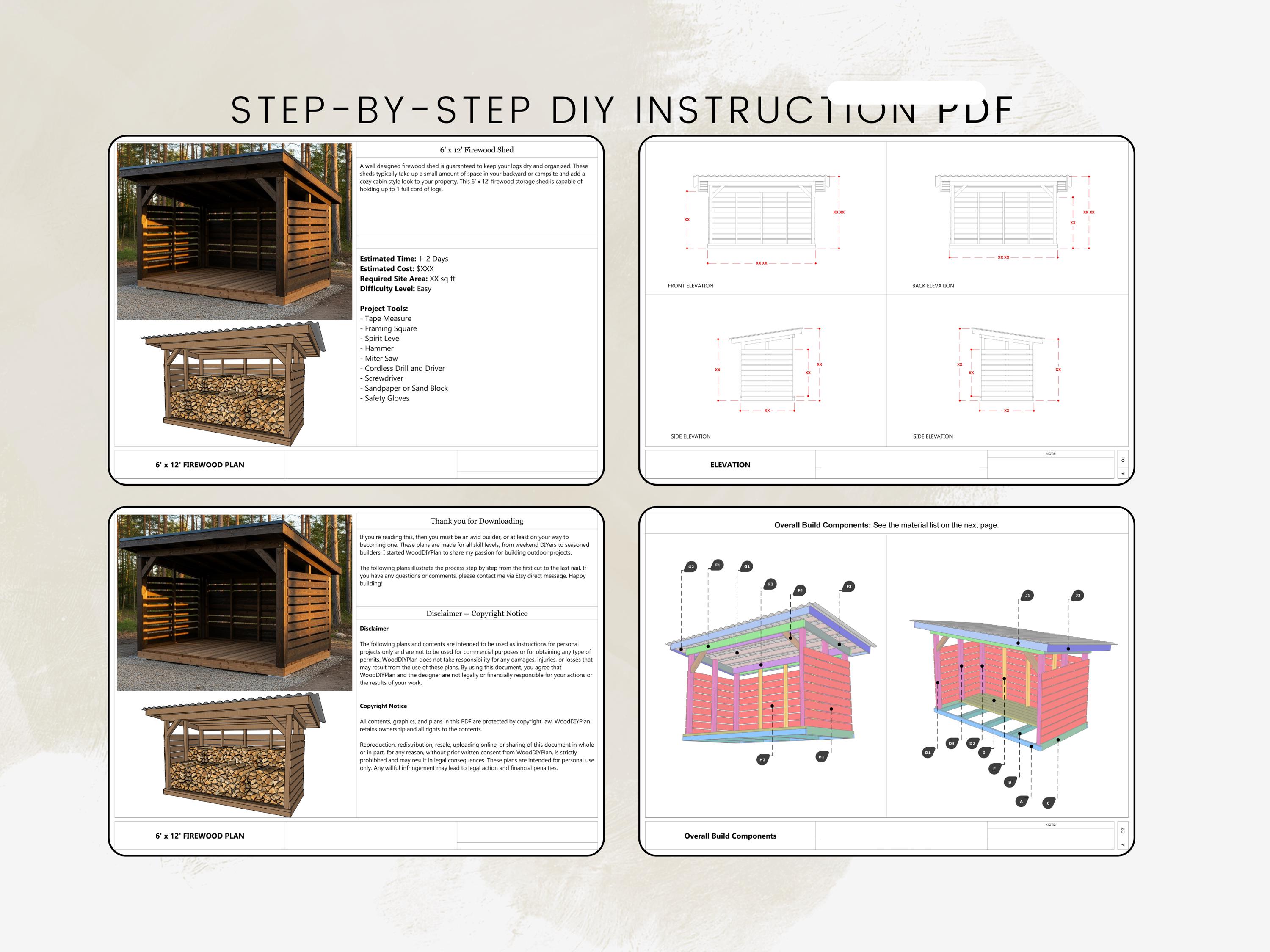 This is the complete 6x12 Firewood Shed DIY Plan, including everything you need to build a strong, beautiful and practical firewood storage shed. All measurements are in Imperial units and the instructions are written in a clear and beginner-friendly way. These plans are designed to minimize waste and save both time and materials. You can also customize the design to suit your own outdoor space or style.
