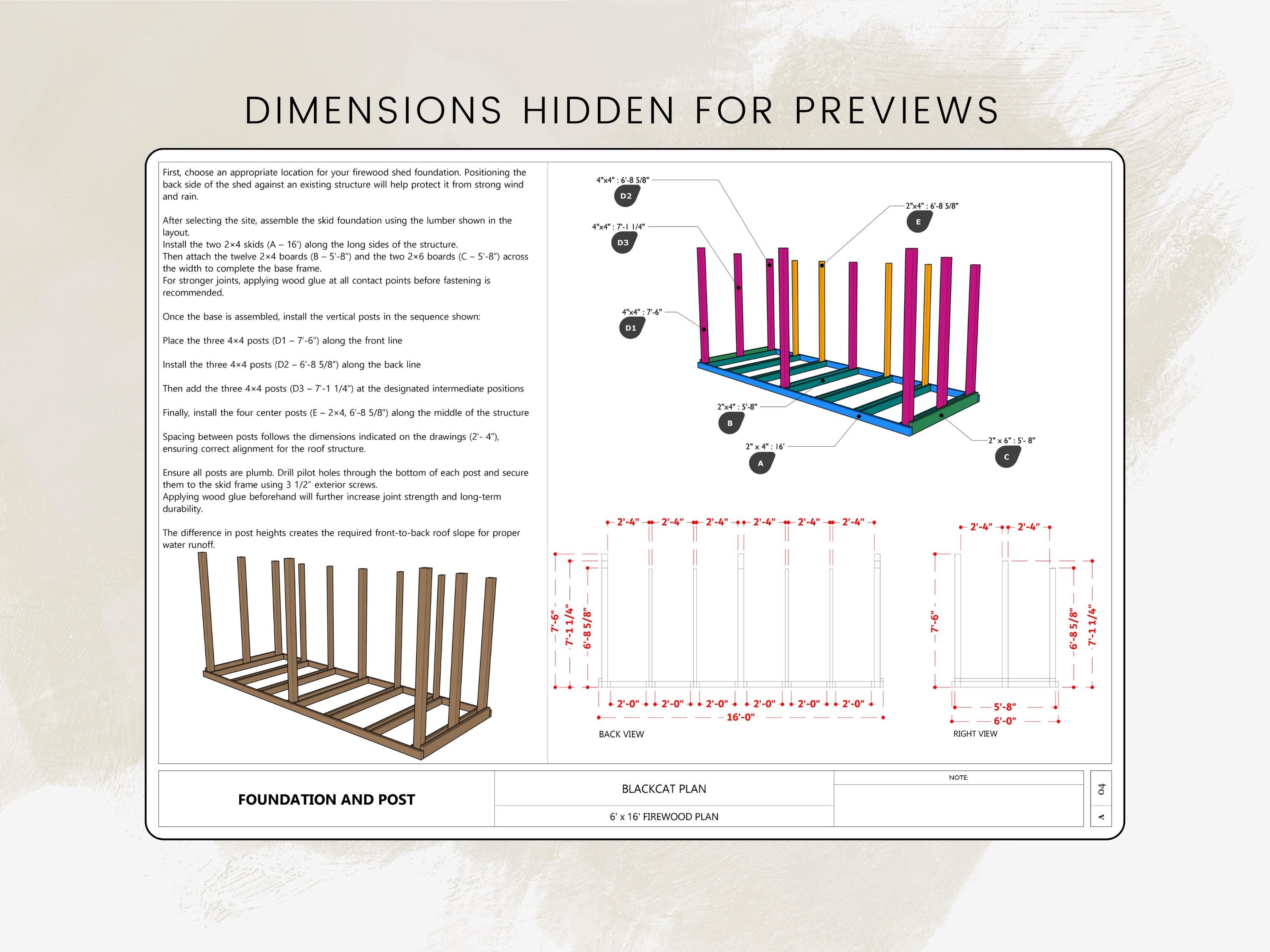 This is the complete 6x16 Firewood Shed DIY Plan, including everything you need to build a strong, beautiful and practical firewood storage shed. All measurements are in Imperial units and the instructions are written in a clear and beginner-friendly way. These plans are designed to minimize waste and save both time and materials. You can also customize the design to suit your own outdoor space or style.