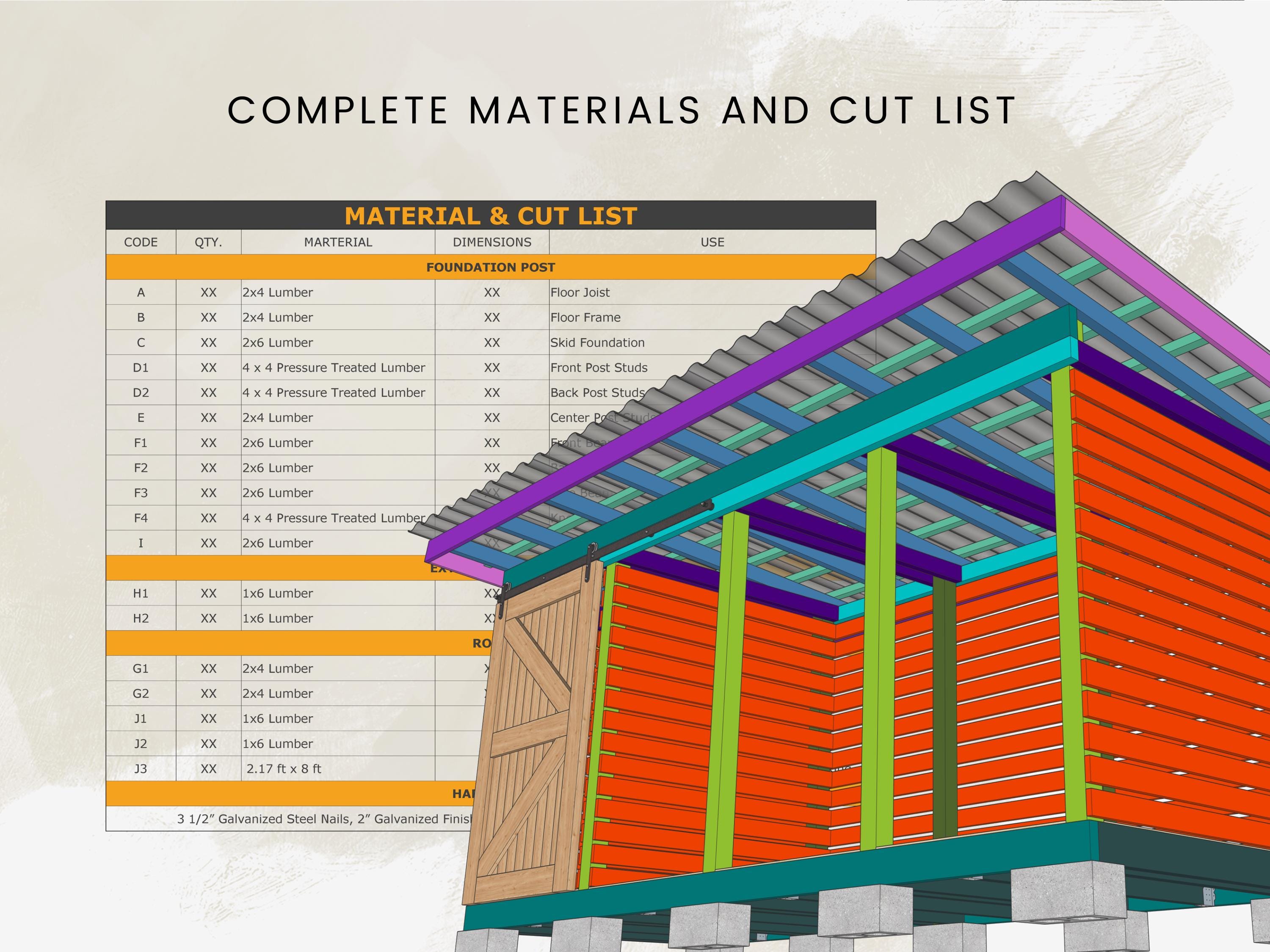 • Roof Structure: 2×4 Rafters with Metal Roofing Panels